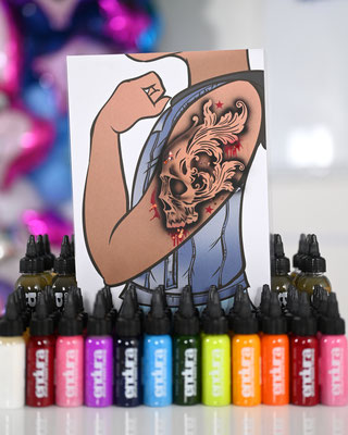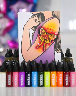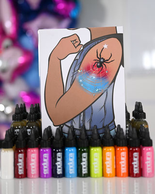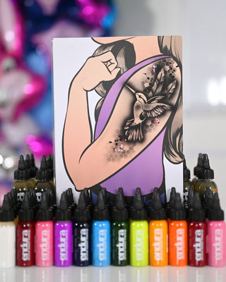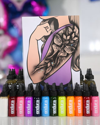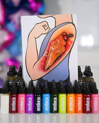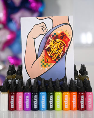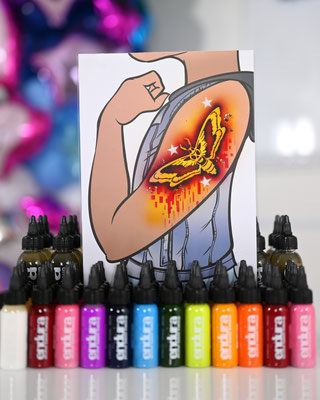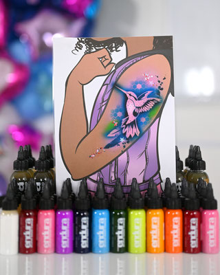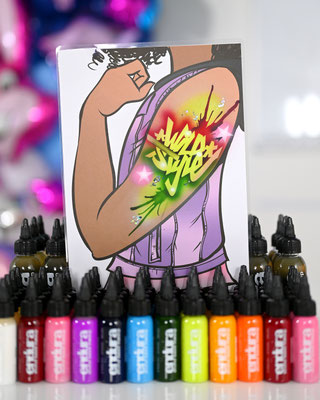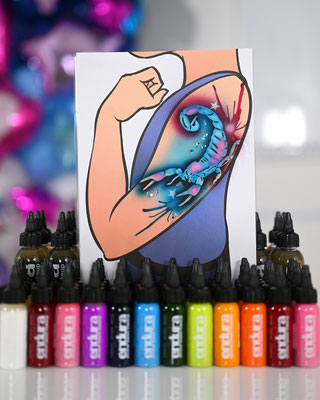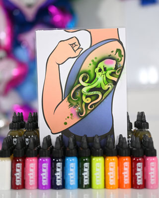 Die Galerie zeigt meinen professionell ausgestatteten Arbeitsplatz, hochwertige Airbrush-Geräte, eine grosse Auswahl an Schablonen und Farben – und natürlich viele begeisterte Gesichter, die stolz ihr neues Tattoo präsentieren.
