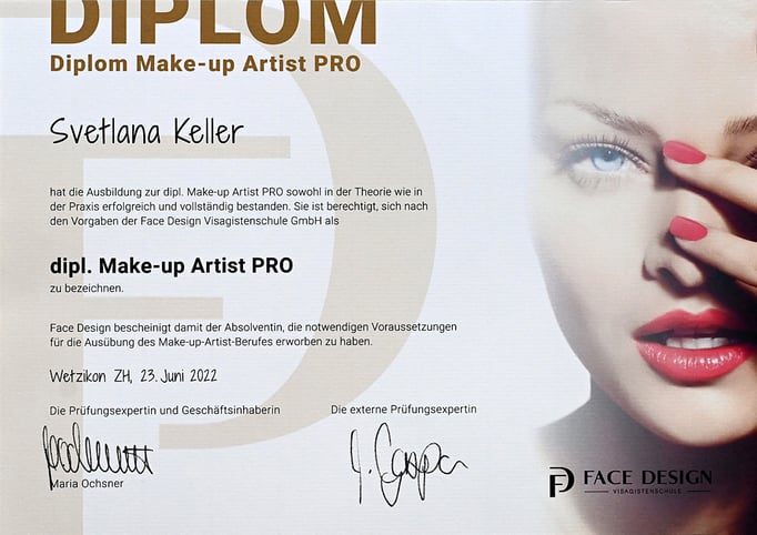 Im Jahr 2022 absolvierte ich eine sechsmonatige Ausbildung zur Visagistin an der renommierten Make-up-Schule „Face Design“ – der wohl angesehensten Ausbildungsstätte dieser Art in der Schweiz.